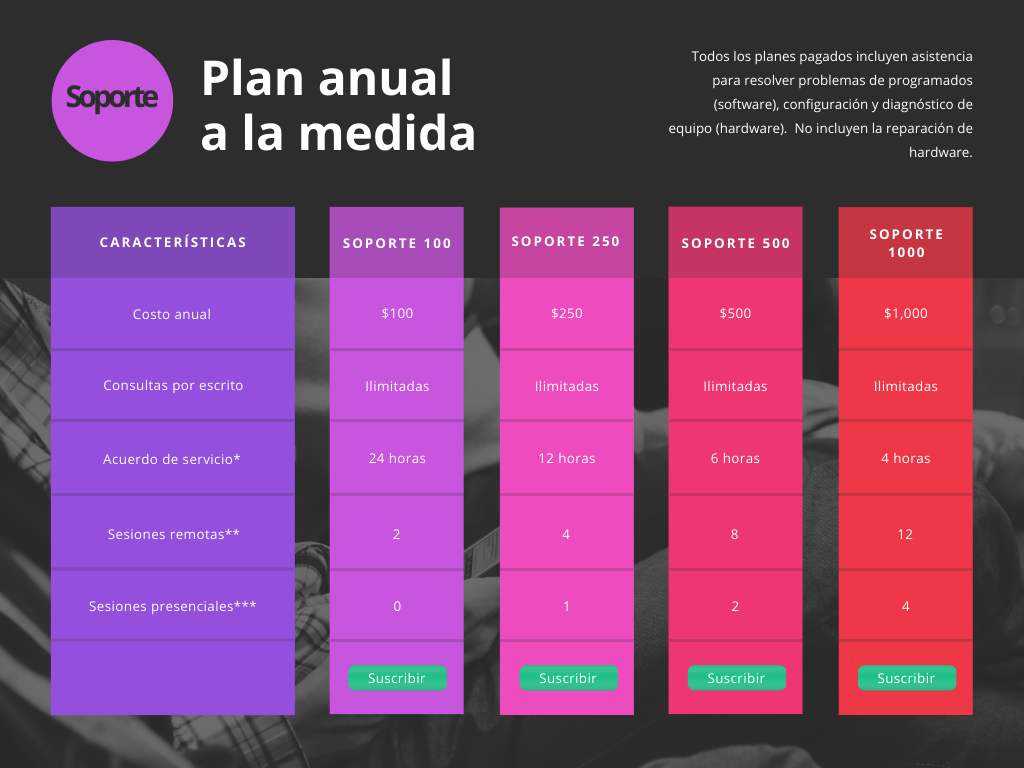 Para todos los planes, se contabilizará sólo una sesión remota o presencial por incidente.  Si por ejemplo, se establecen varias sesiones para un problema, se contarán como una sesión usada.